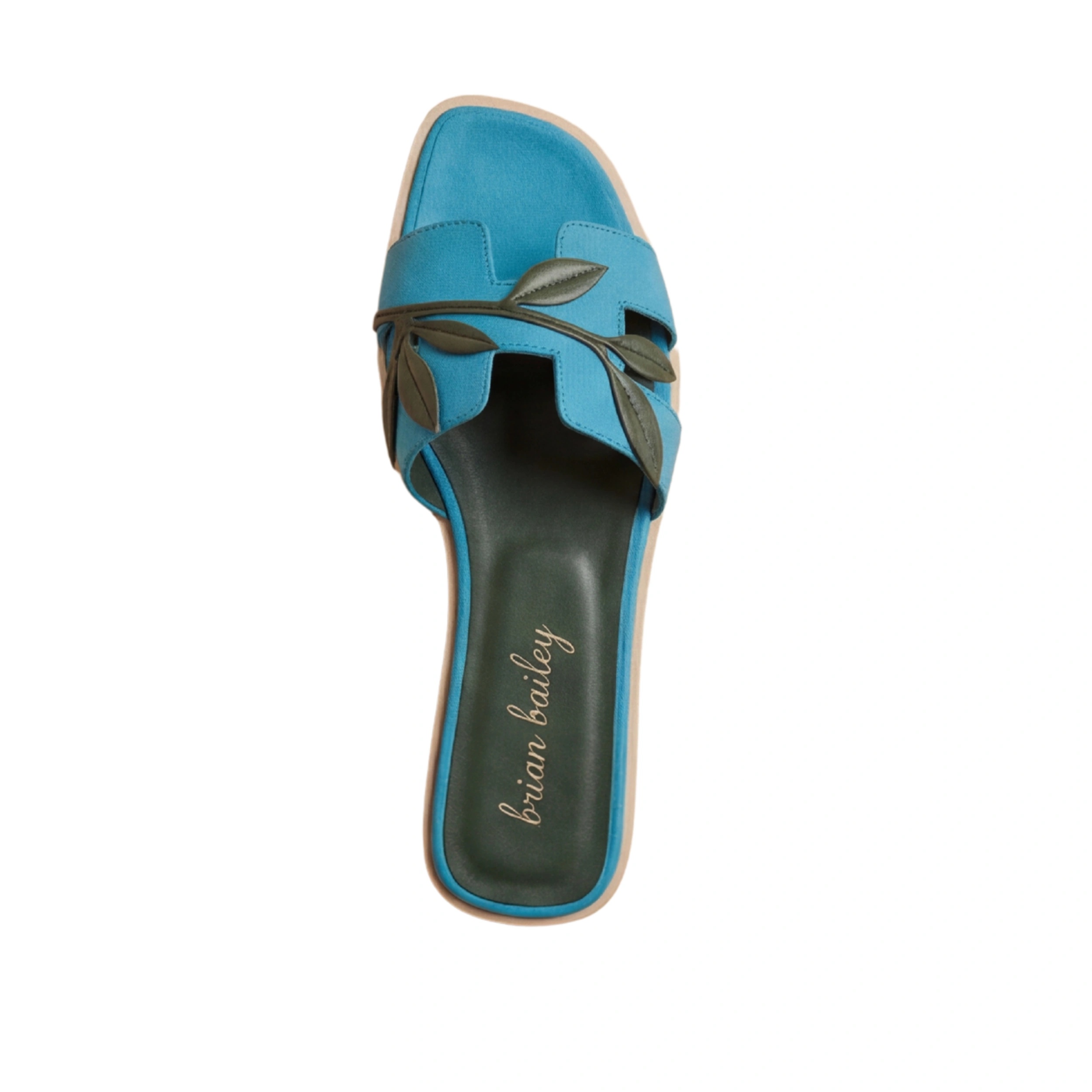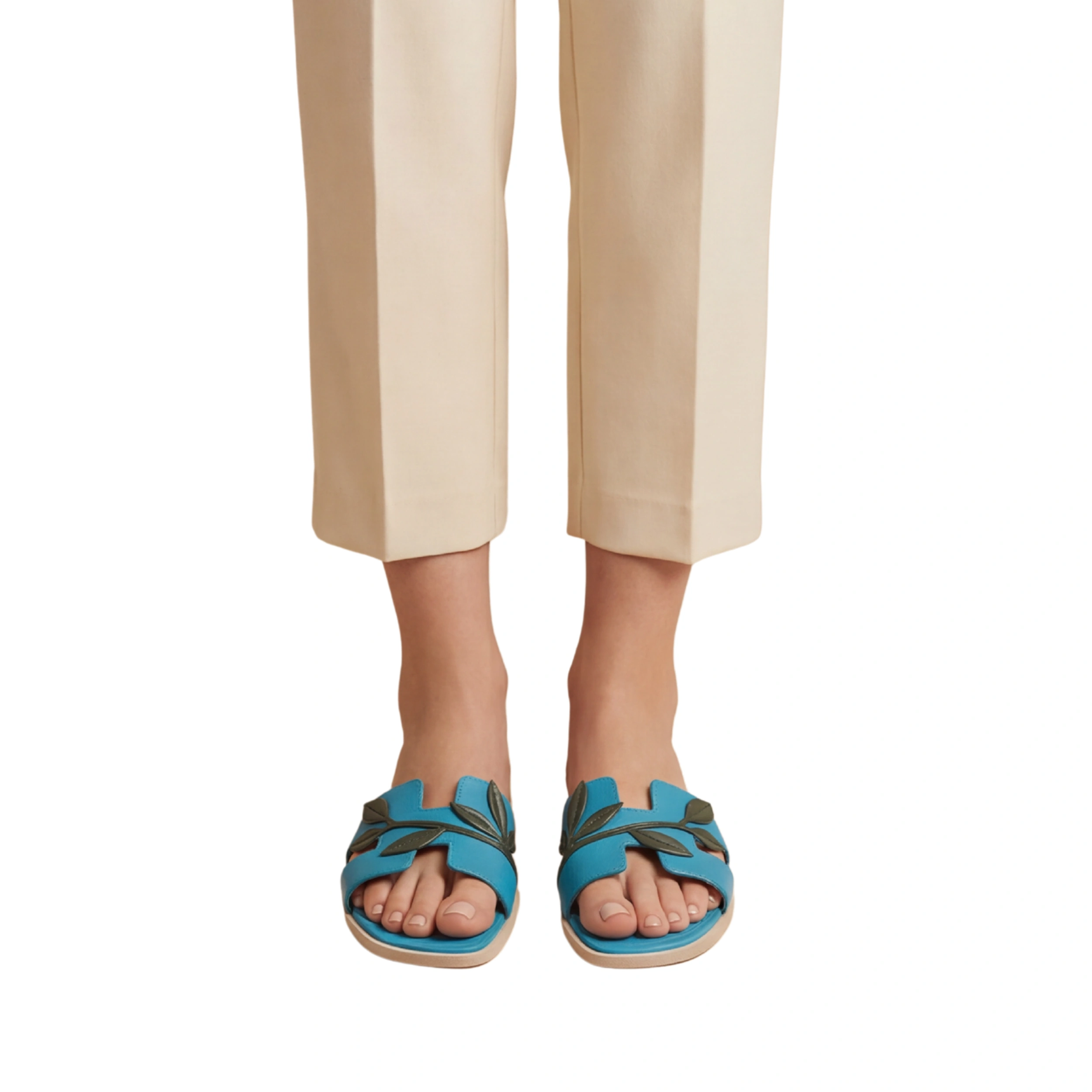 The Azure Gardenia Leaf-Embellished Slides are a vibrant fusion of botanical art and relaxed luxury. This design transitions from the dark, structured aesthetic of avant-garde loafers into a refreshing, open-air silhouette defined by its bold color and three-dimensional detailing.