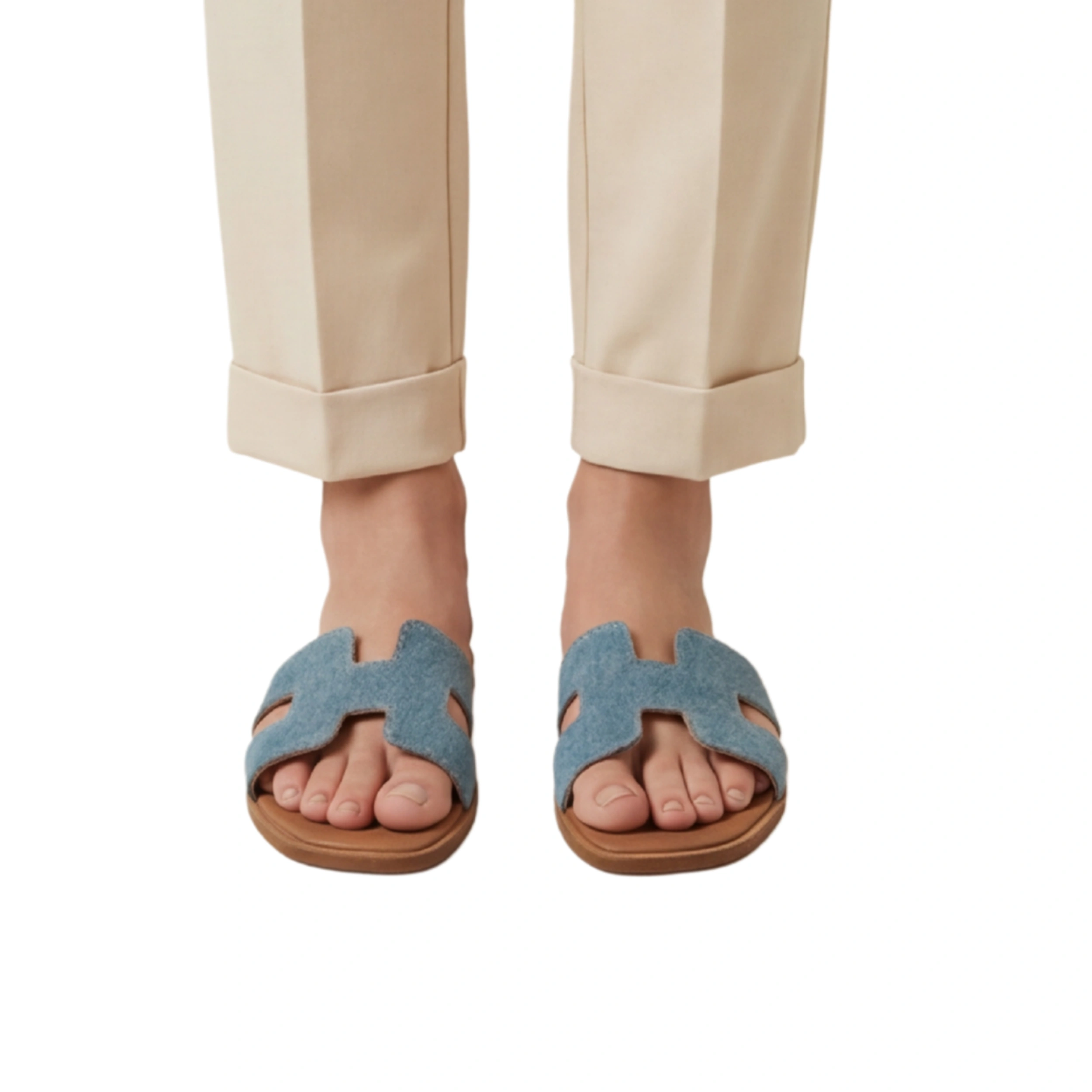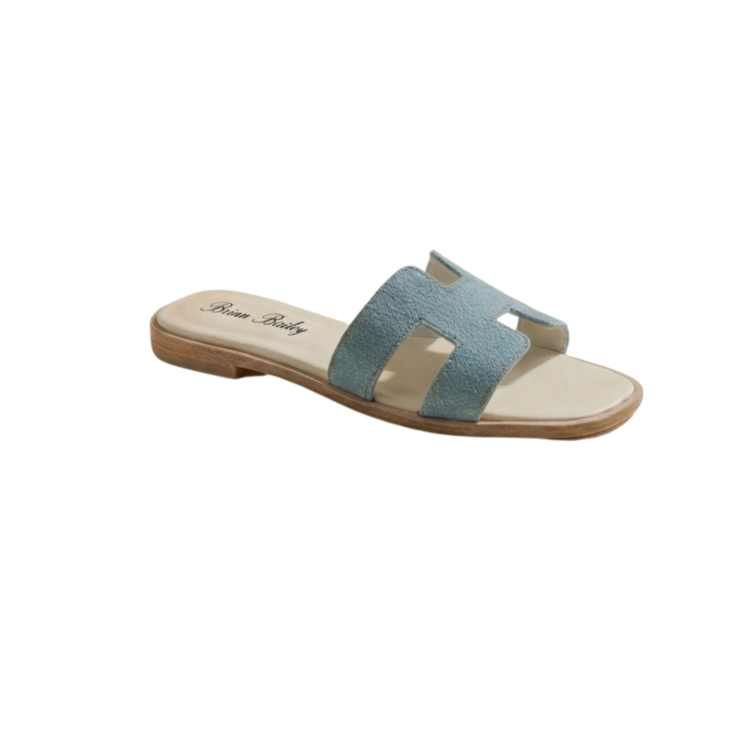 Capture a fresh, coastal aesthetic with these Brian Bailey flat slides, featuring a breezy light-wash denim upper. This signature silhouette is defined by the iconic “H” cutout strap, which offers a modern architectural look while providing a secure and comfortable fit across the foot. The cool blue denim is beautifully offset by a crisp cream-colored footbed, creating a clean, high-contrast palette perfect for warm-weather styling.