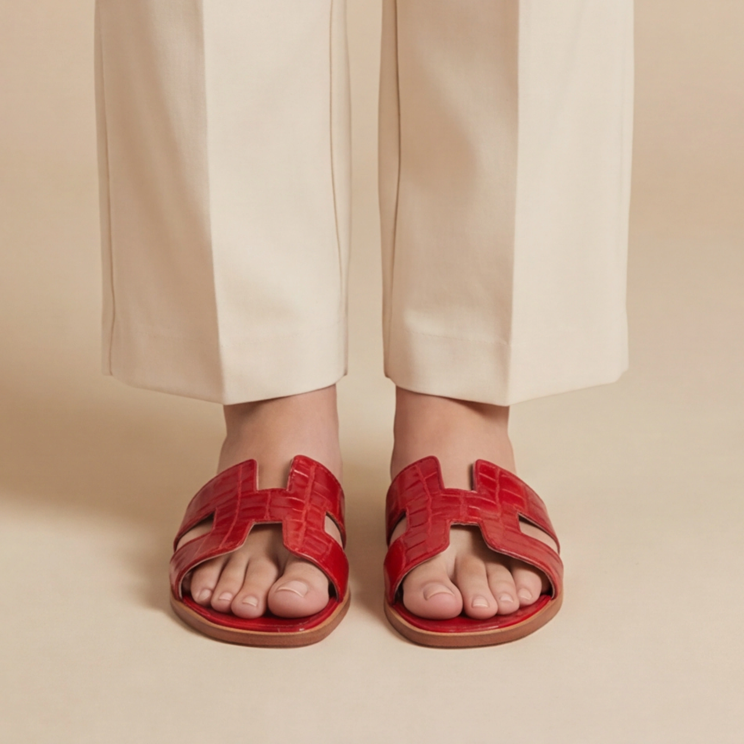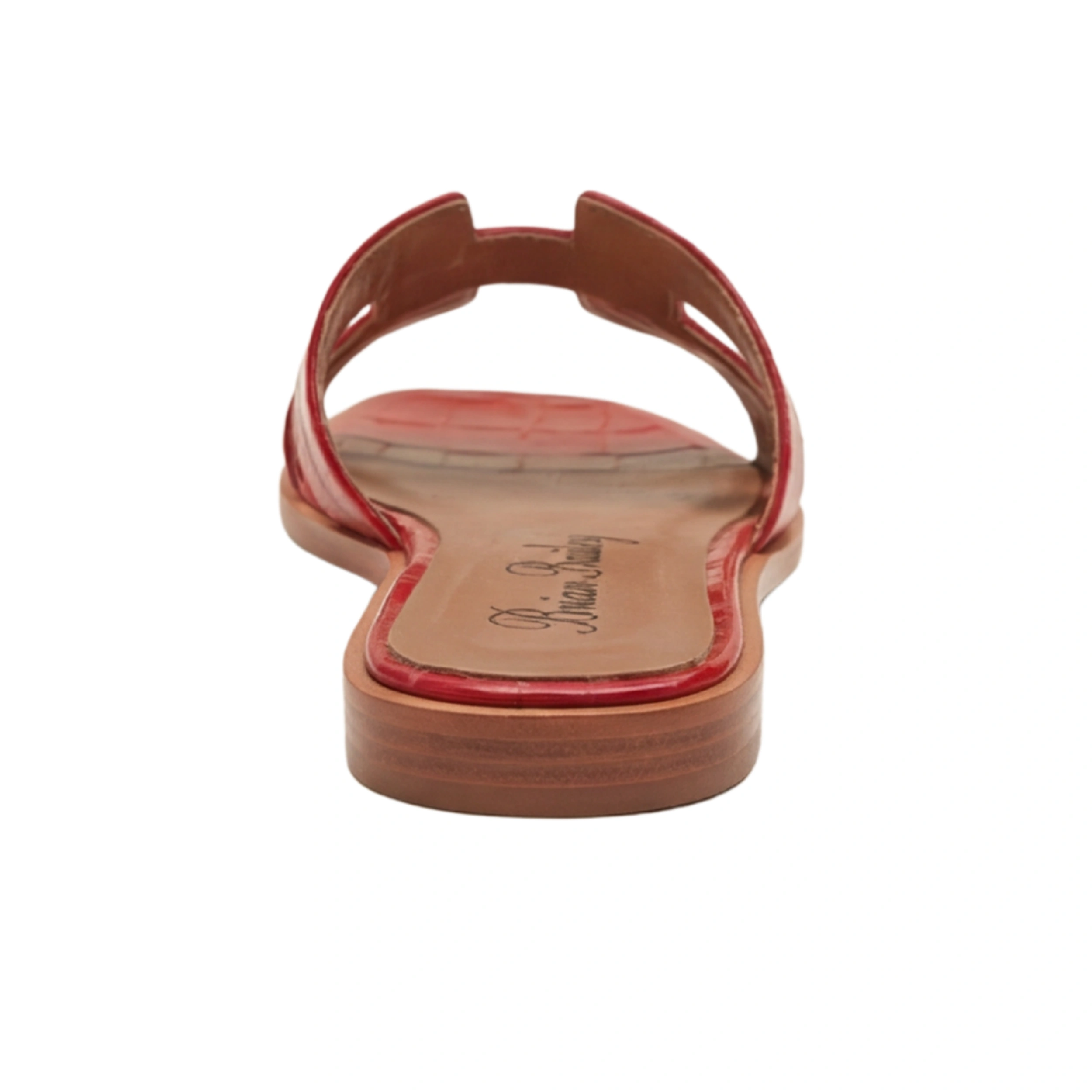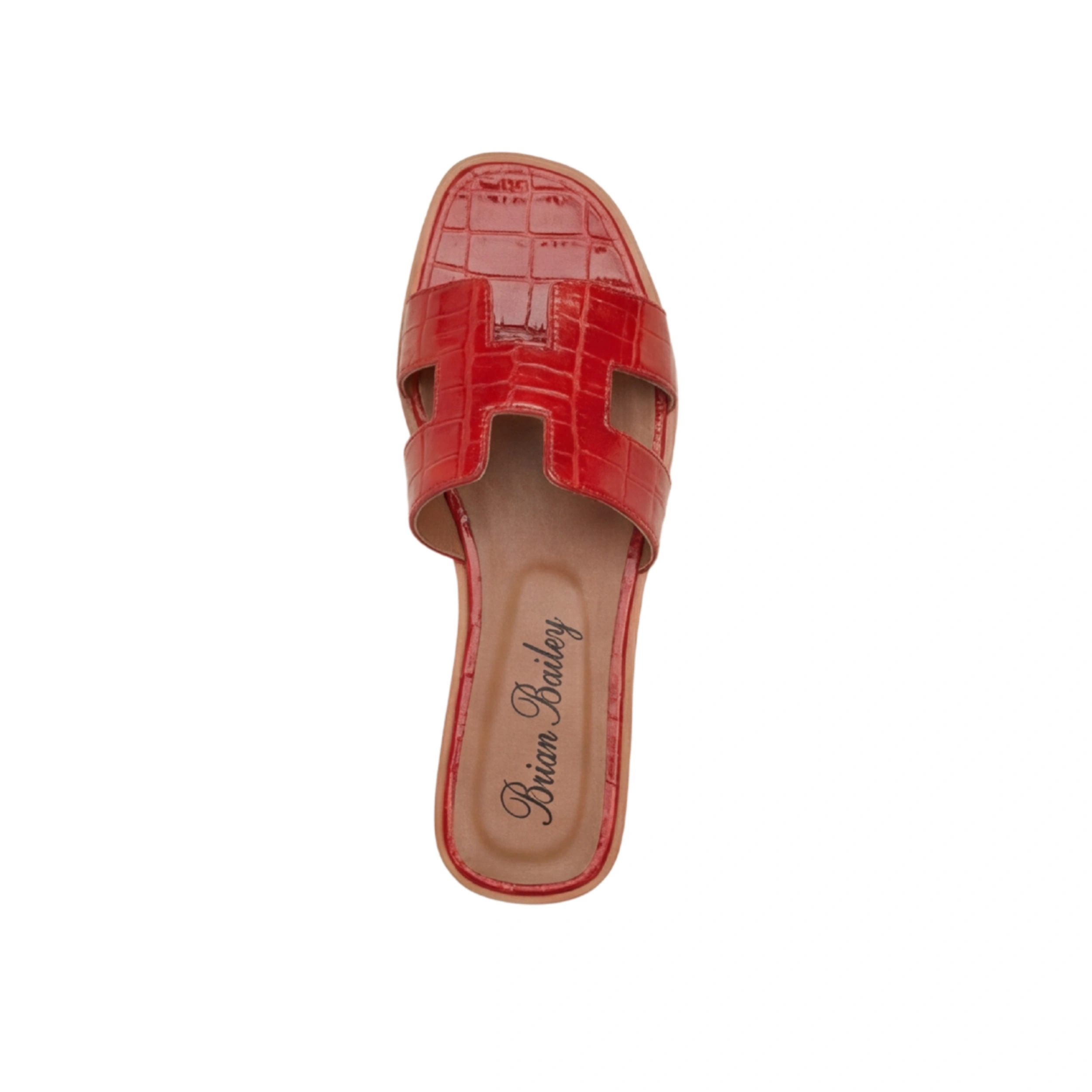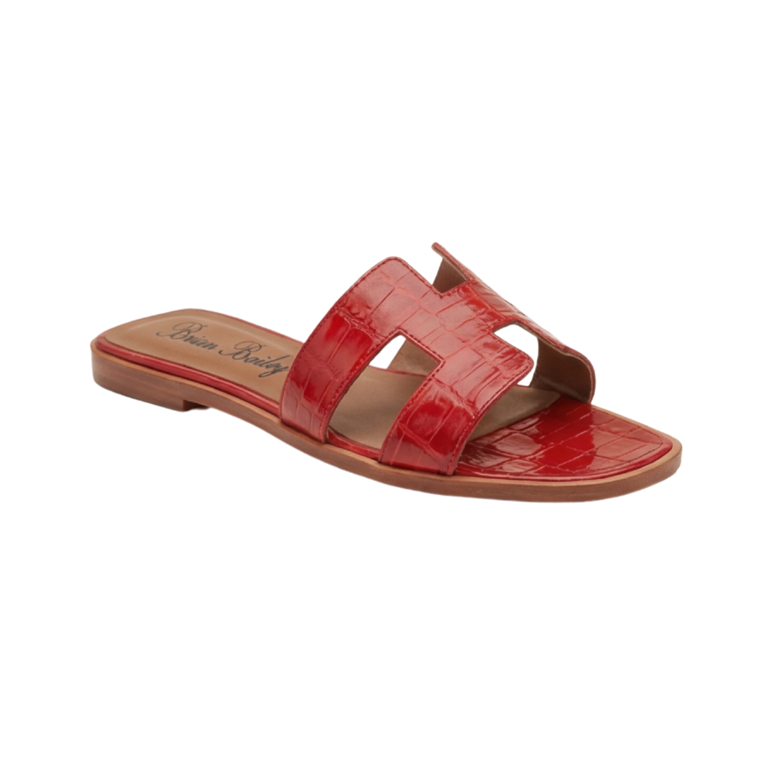 Make a vibrant statement with these high-fashion Brian Bailey flat slides in a bold ruby red. This striking iteration of the signature silhouette is crafted from premium croc-embossed leather with a glossy patent finish, offering a luxurious texture that beautifully reflects the light. The iconic “H” cutout strap provides a modern, architectural look while maintaining a secure and breathable fit.
