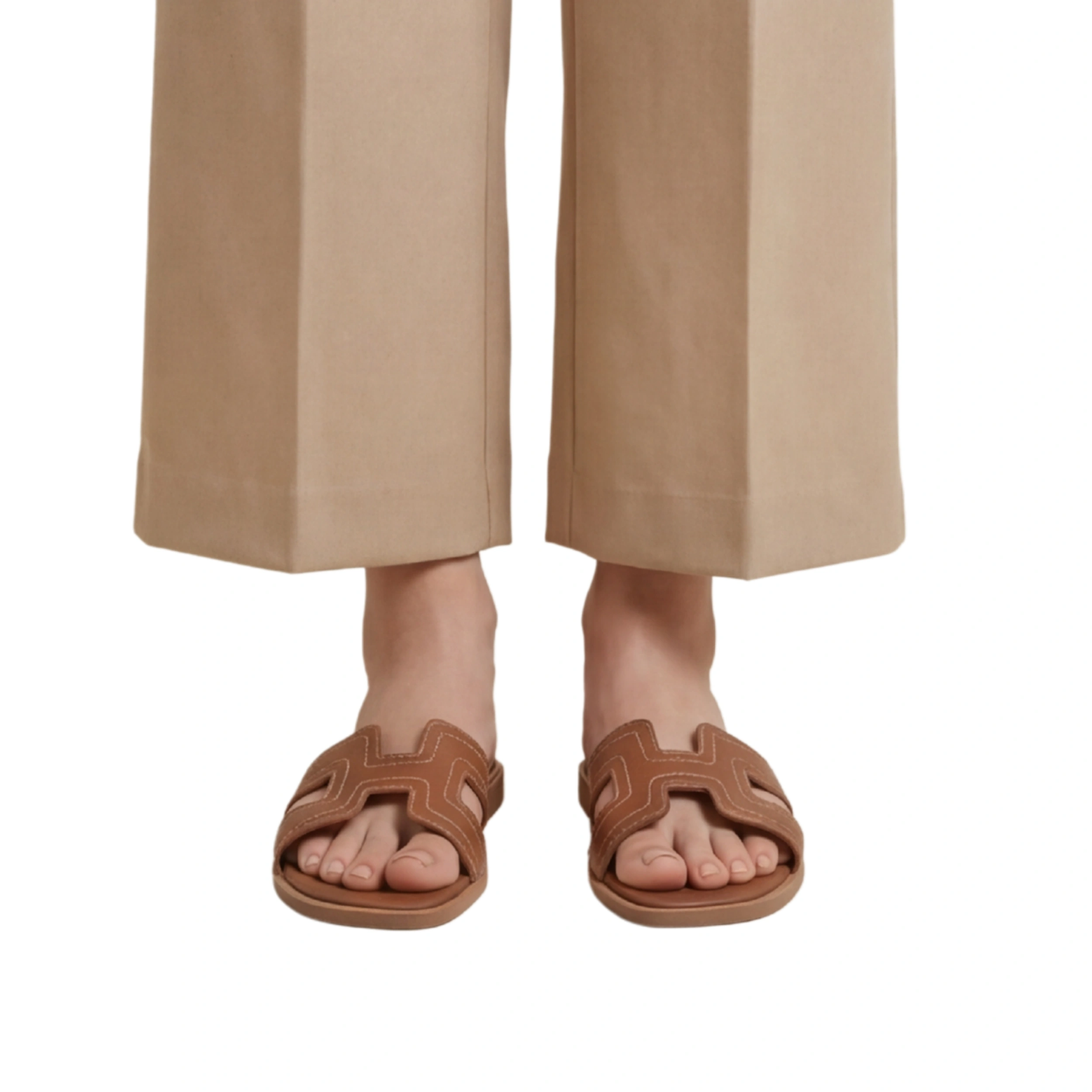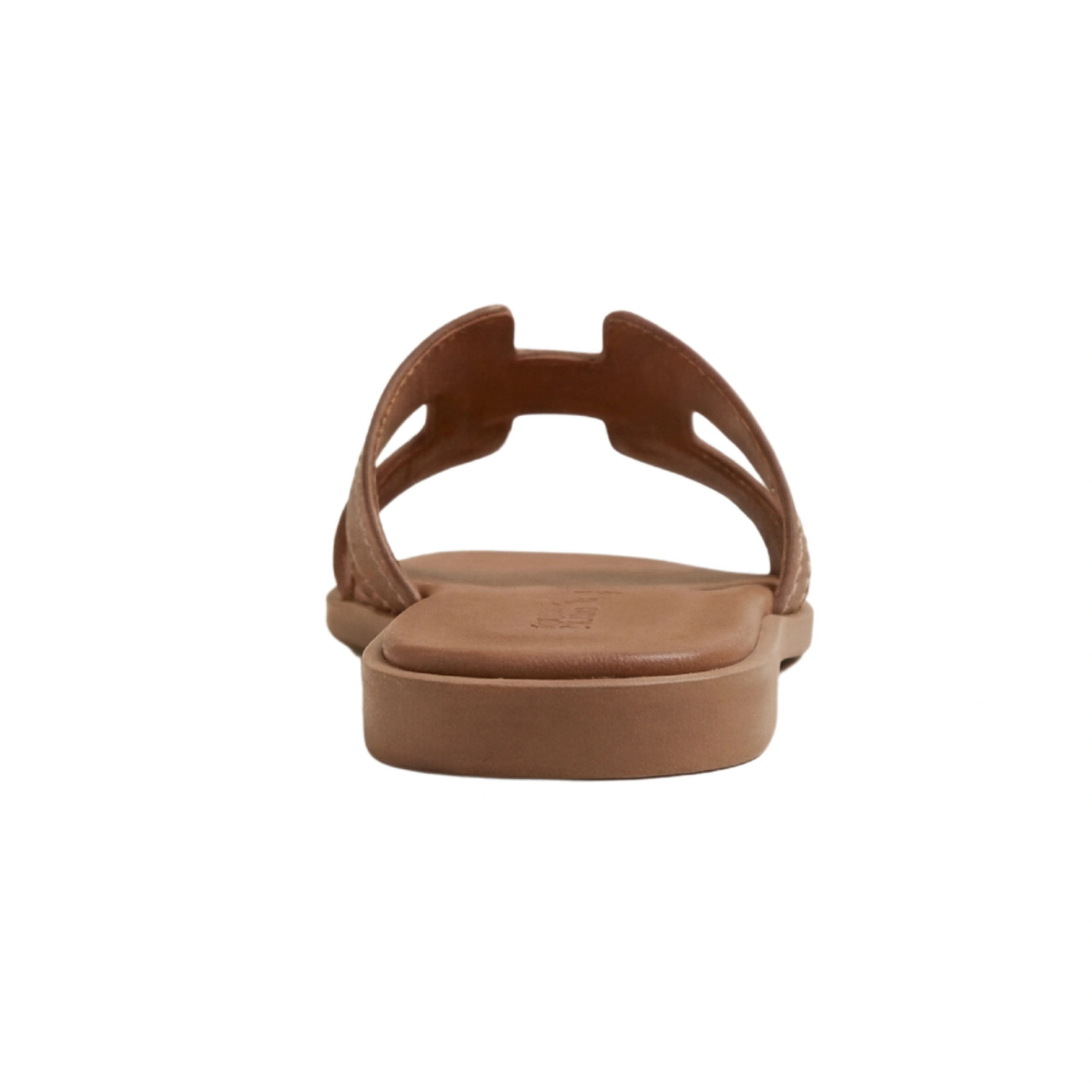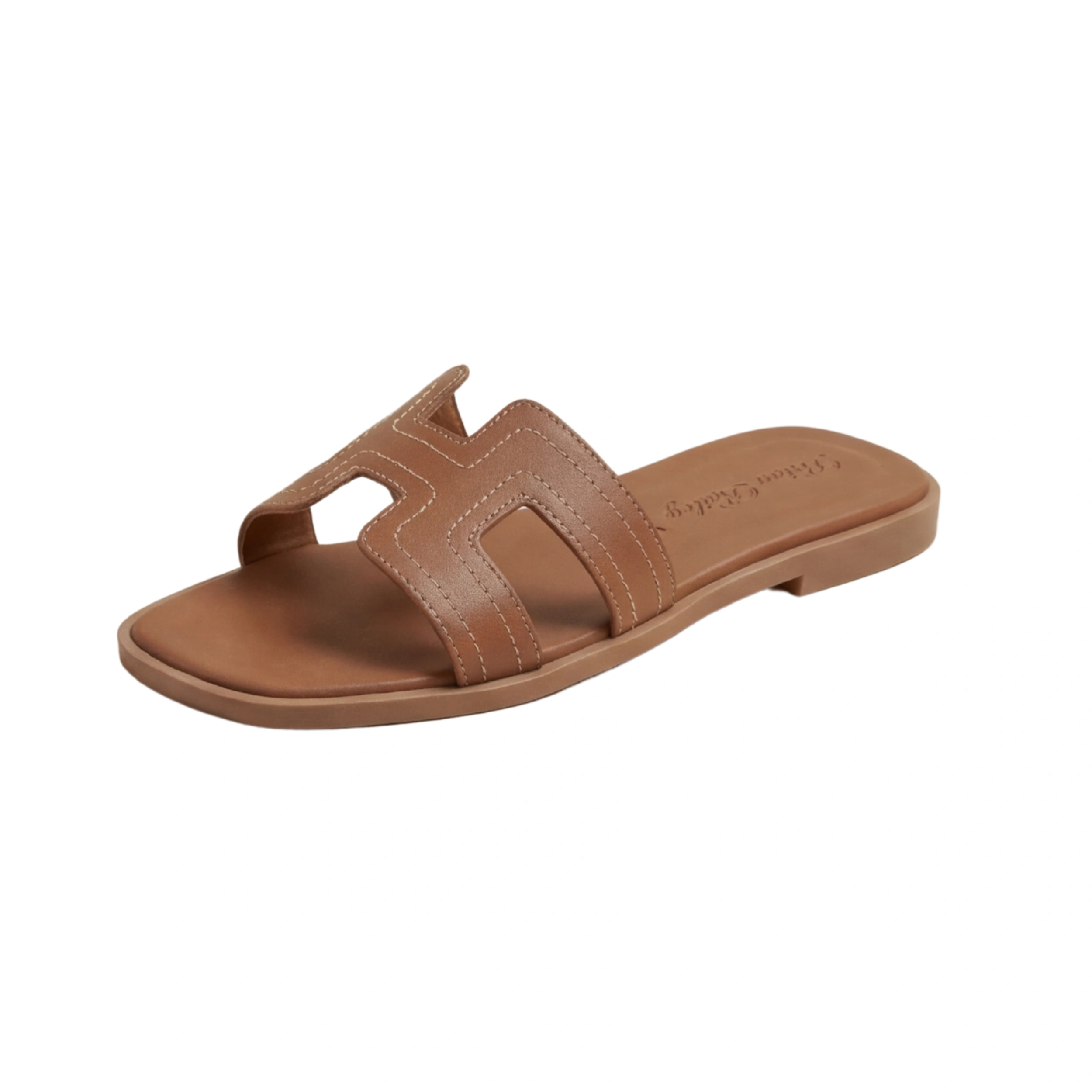 Elevate your everyday ensemble with the understated luxury of these Brian Bailey leather slides. This design features a monochromatic, earth-toned palette that emphasizes clean lines and premium materials. The signature “H” cutout upper is crafted from smooth, high-quality tan leather and accented with intricate white contrast stitching that highlights its architectural shape.