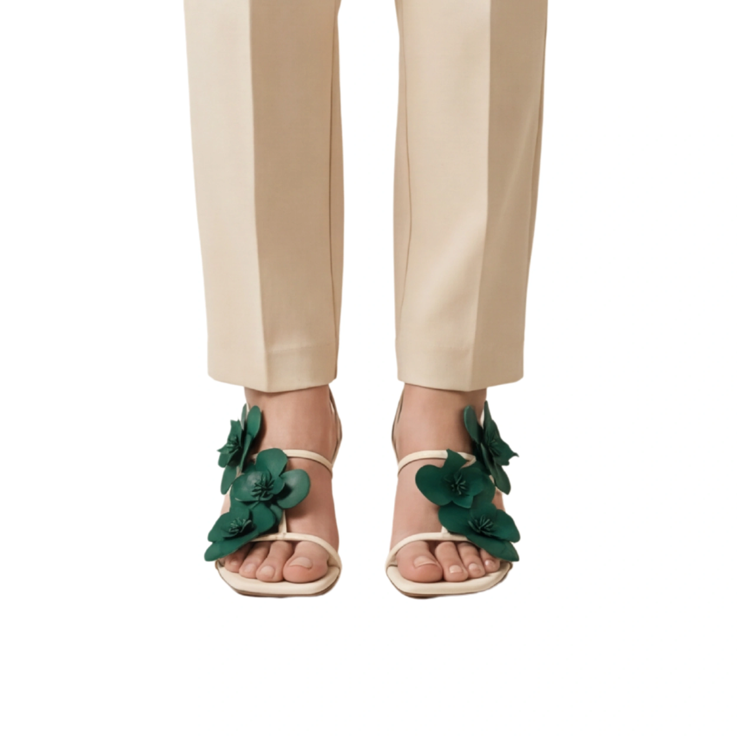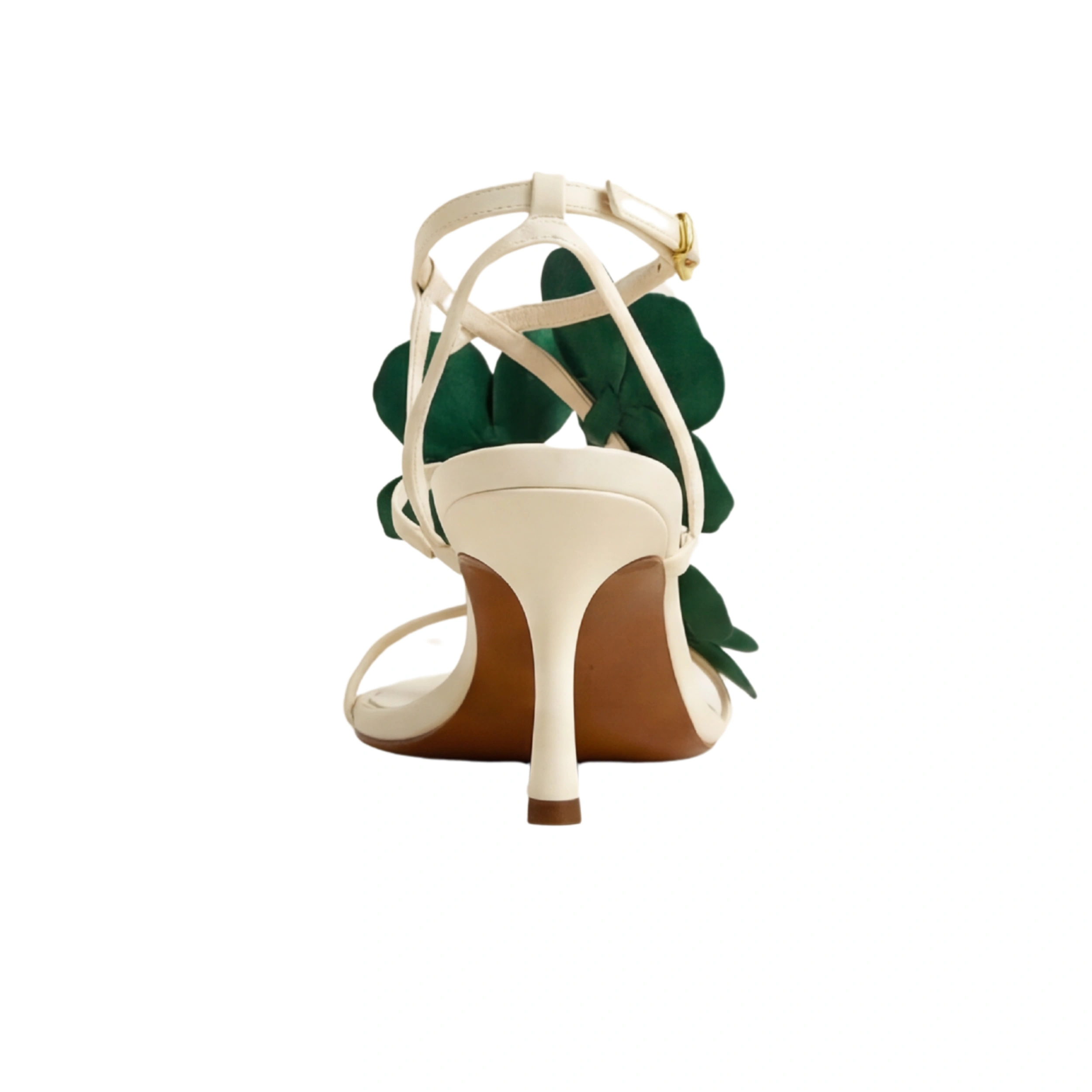 Luminous Off-White Base: Features a crisp, alabaster-toned footbed and slender straps that allow the rich green blossoms to stand out.