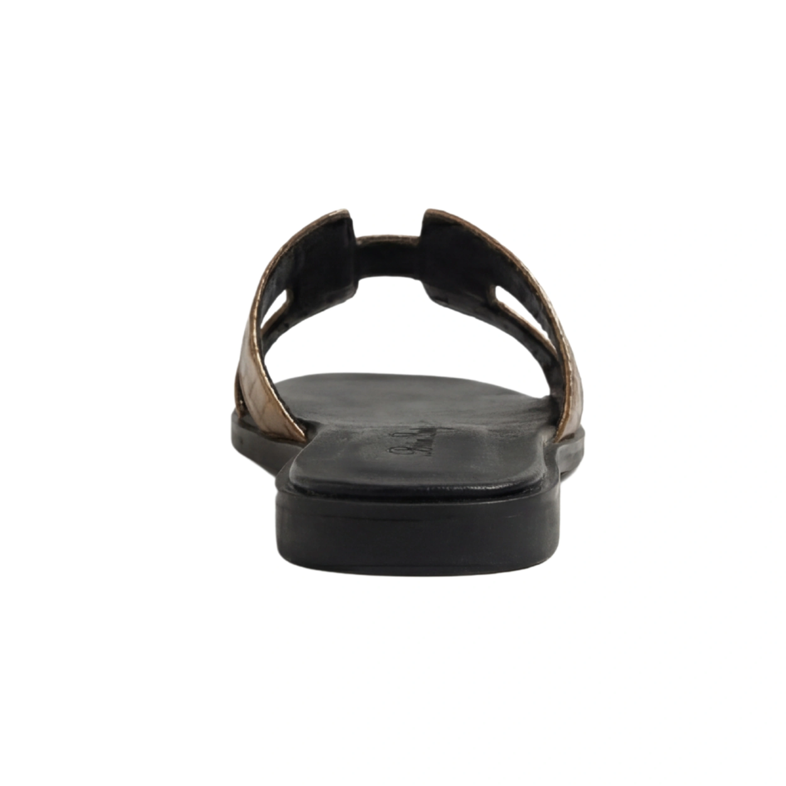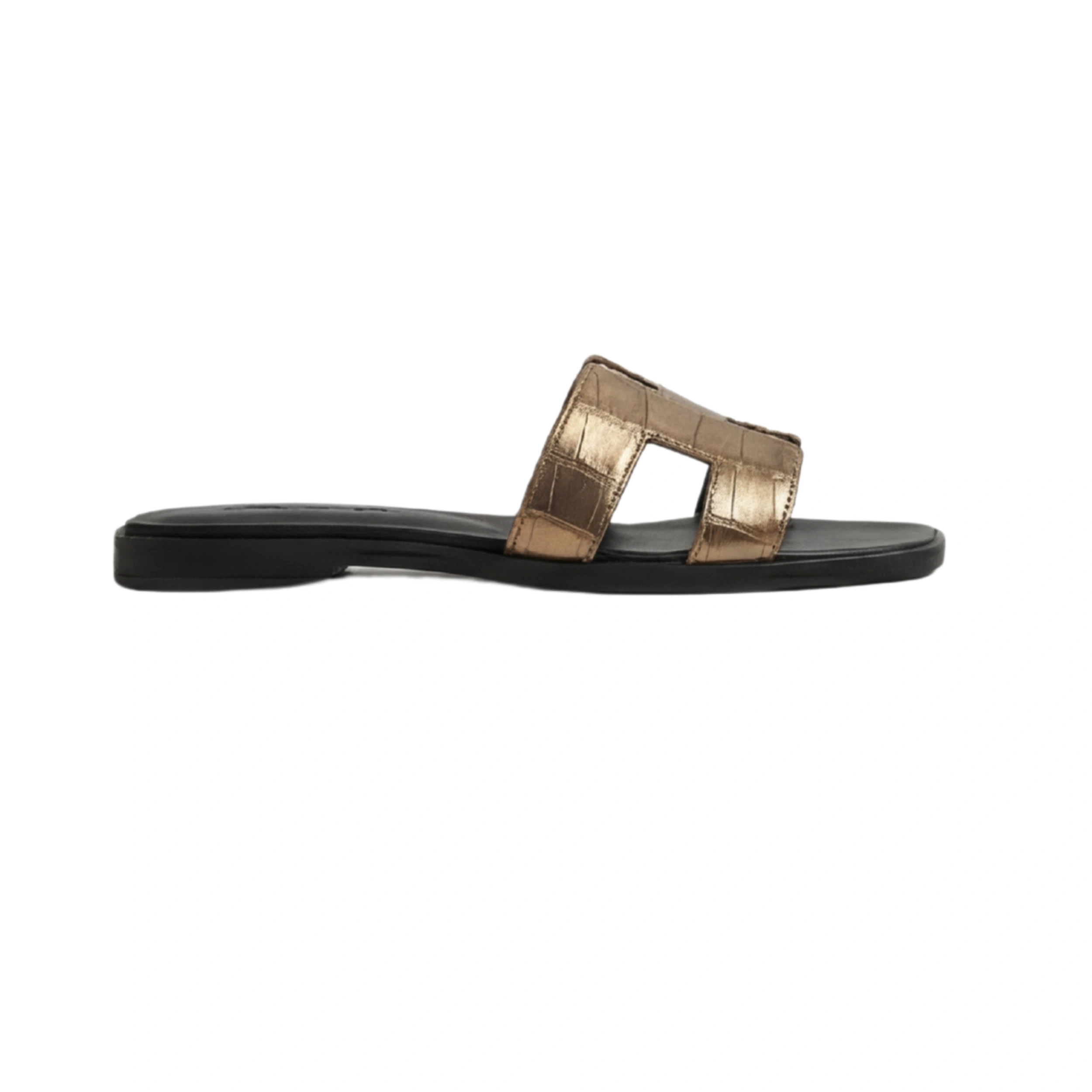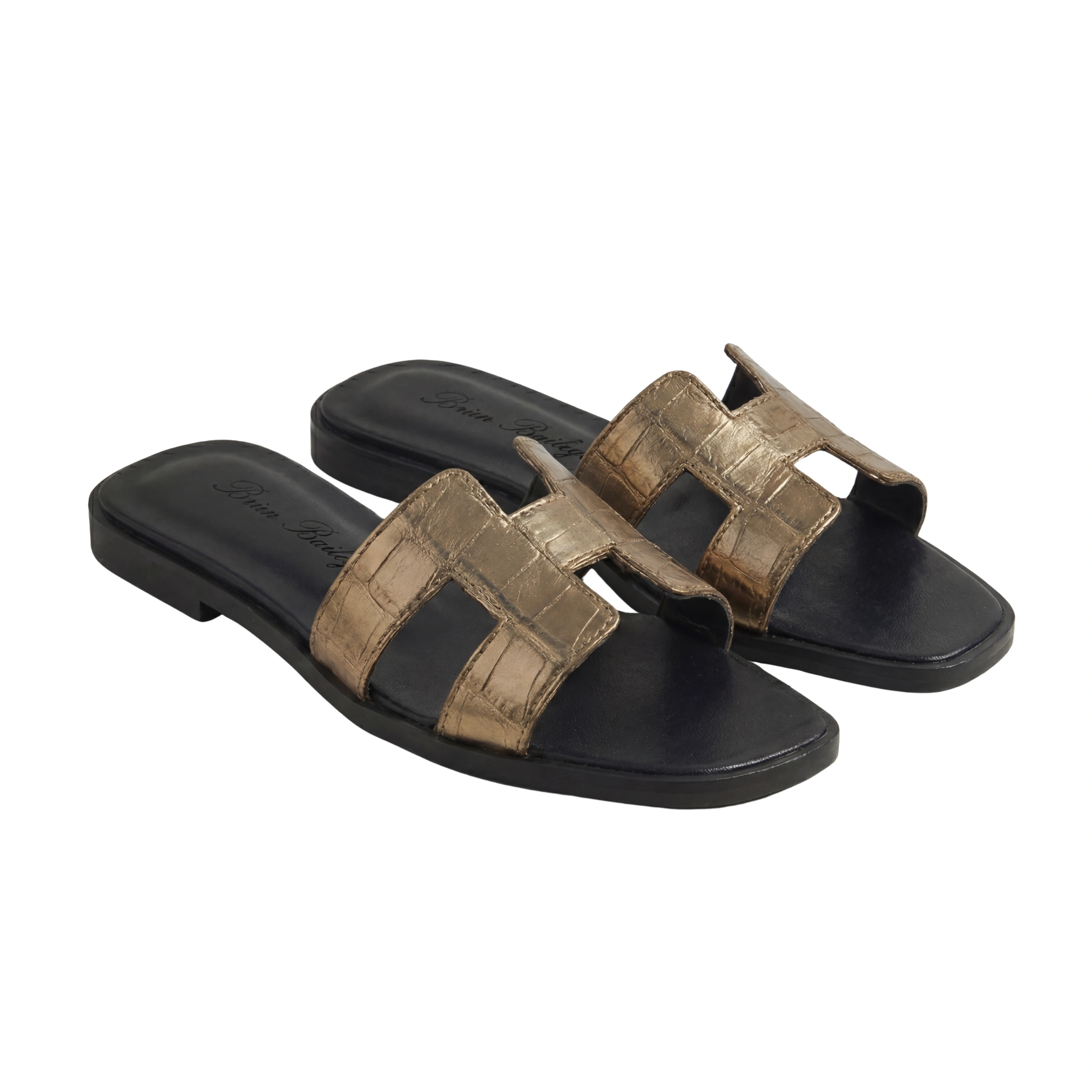 Exude effortless opulence with the Brian Bailey Metallic Gold Slides. This striking addition to the signature “H” collection features a luminous, antique gold finish applied to a deeply textured croc-embossed leather. The metallic sheen catches the light with every step, transforming a classic casual silhouette into a high-impact statement piece.