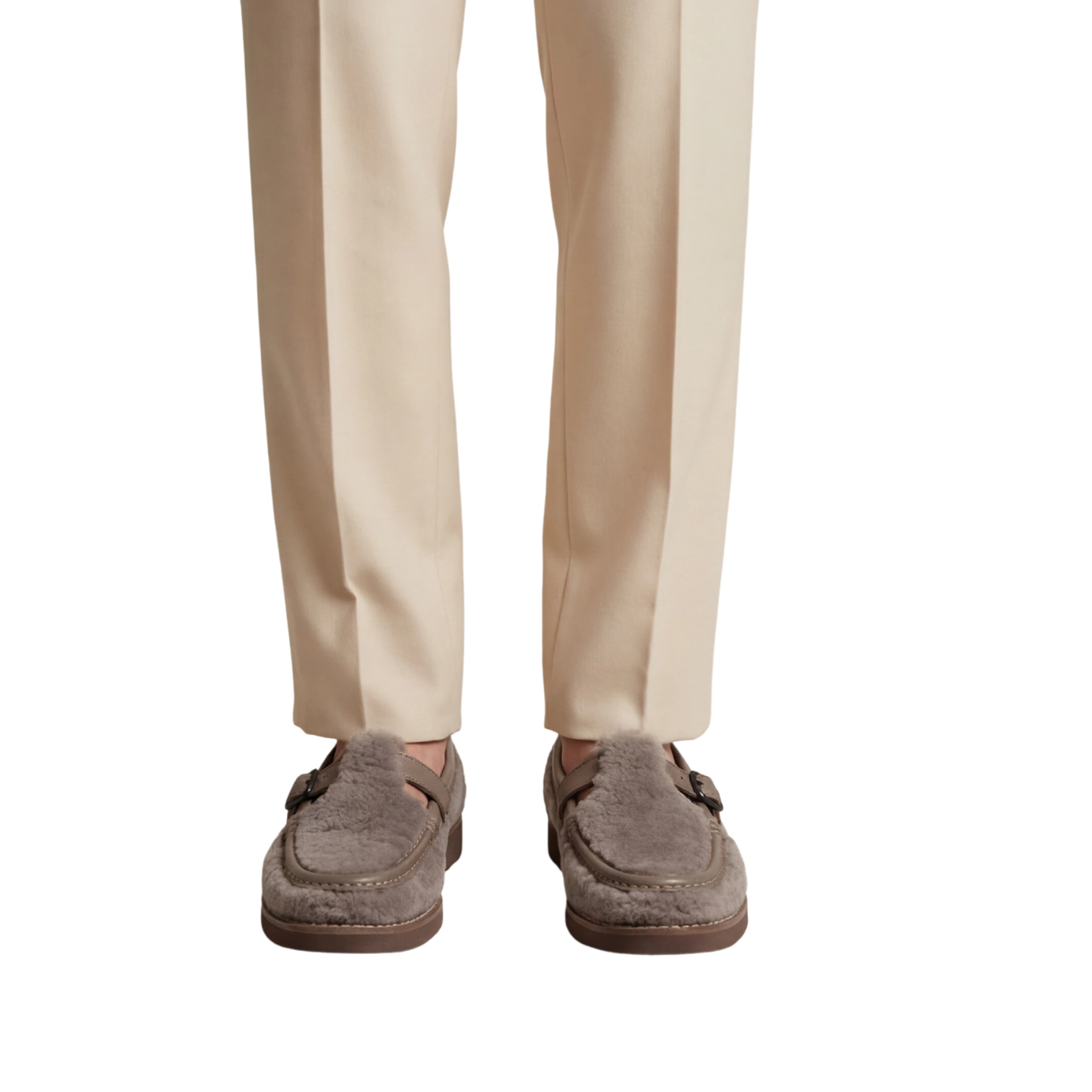 The Plush Taupe Faux-Fur Buckled Loafers are a tactile masterpiece designed for those who prioritize both high-fashion aesthetics and exceptional comfort. This unique footwear choice blends the cozy appeal of loungewear with the structured silhouette of a classic street shoe.