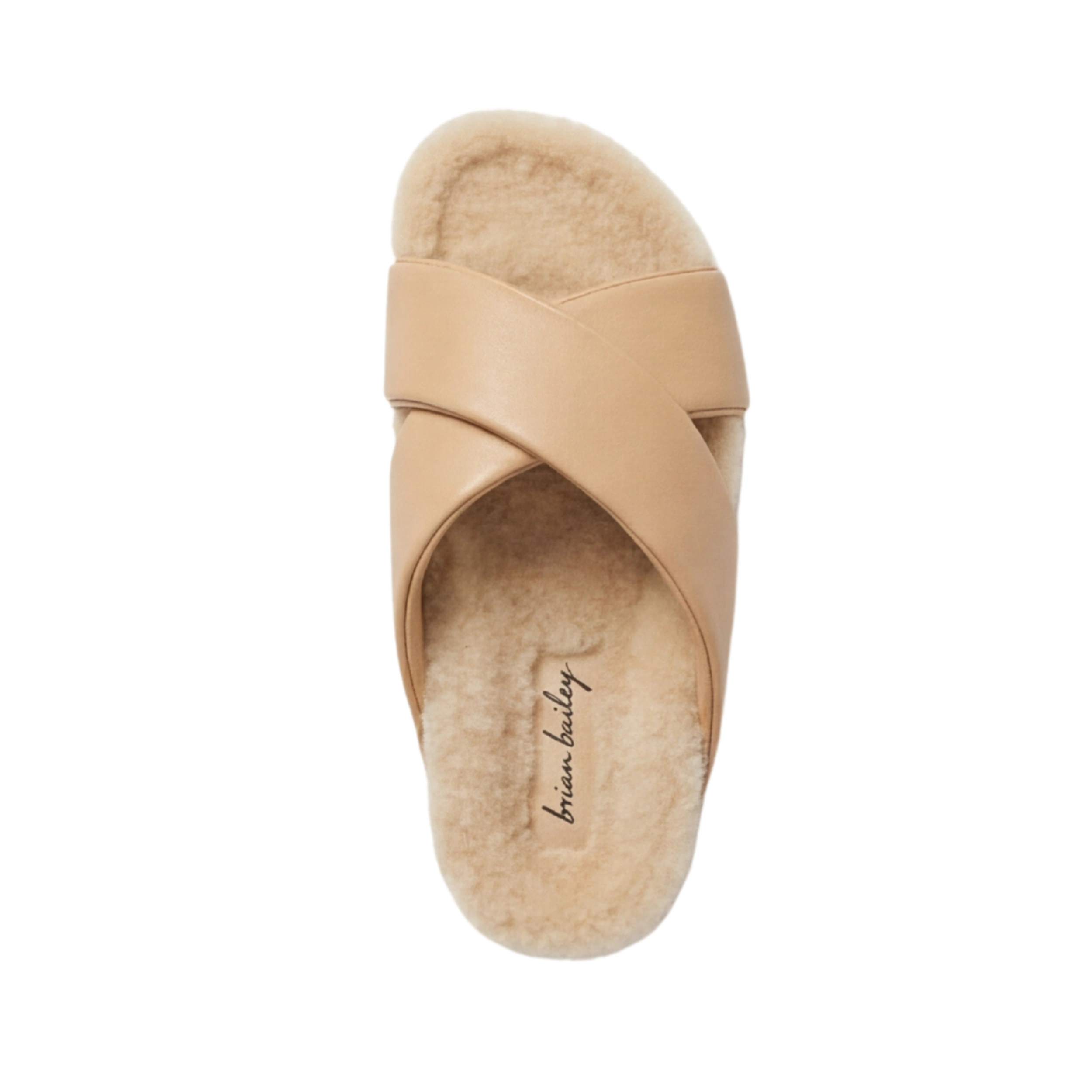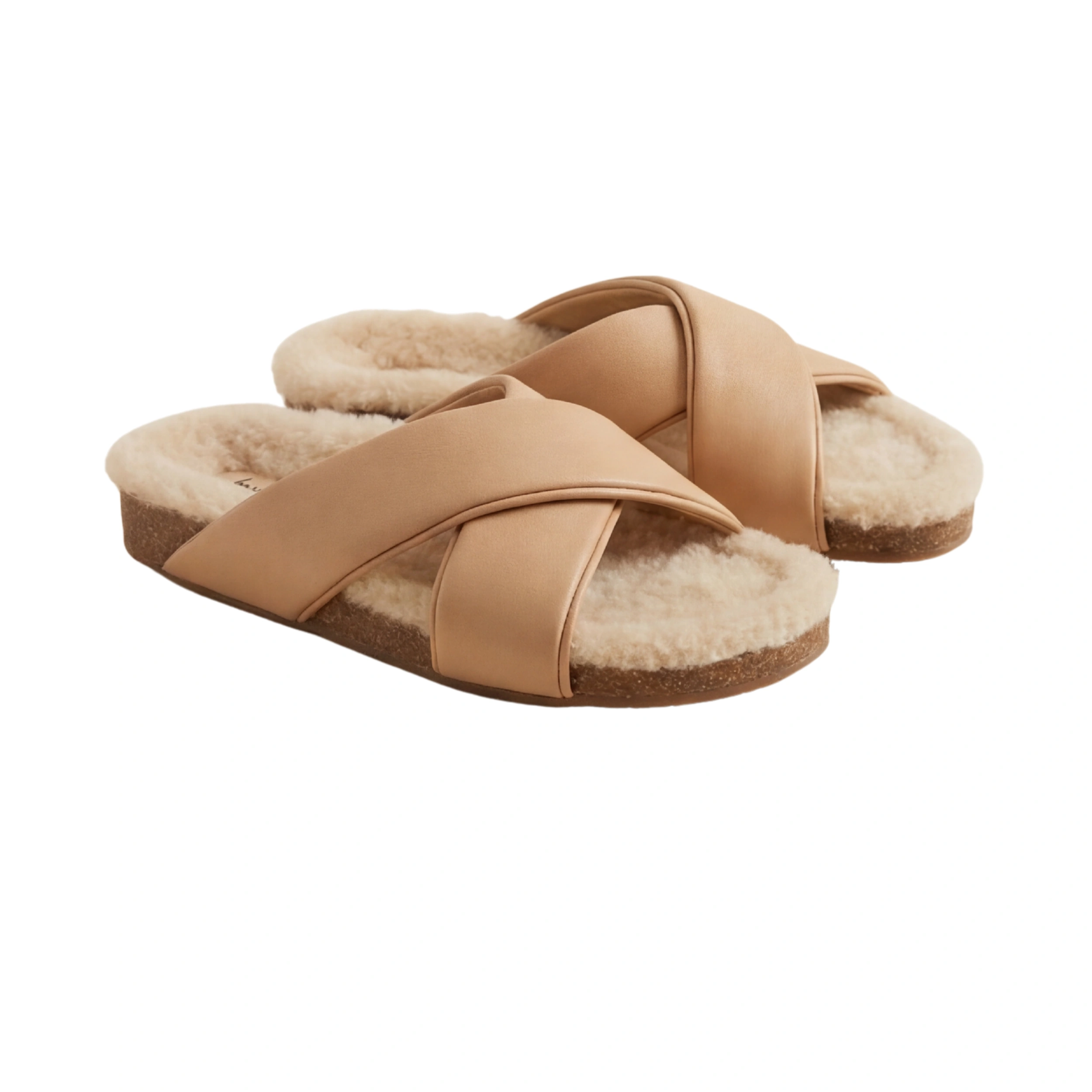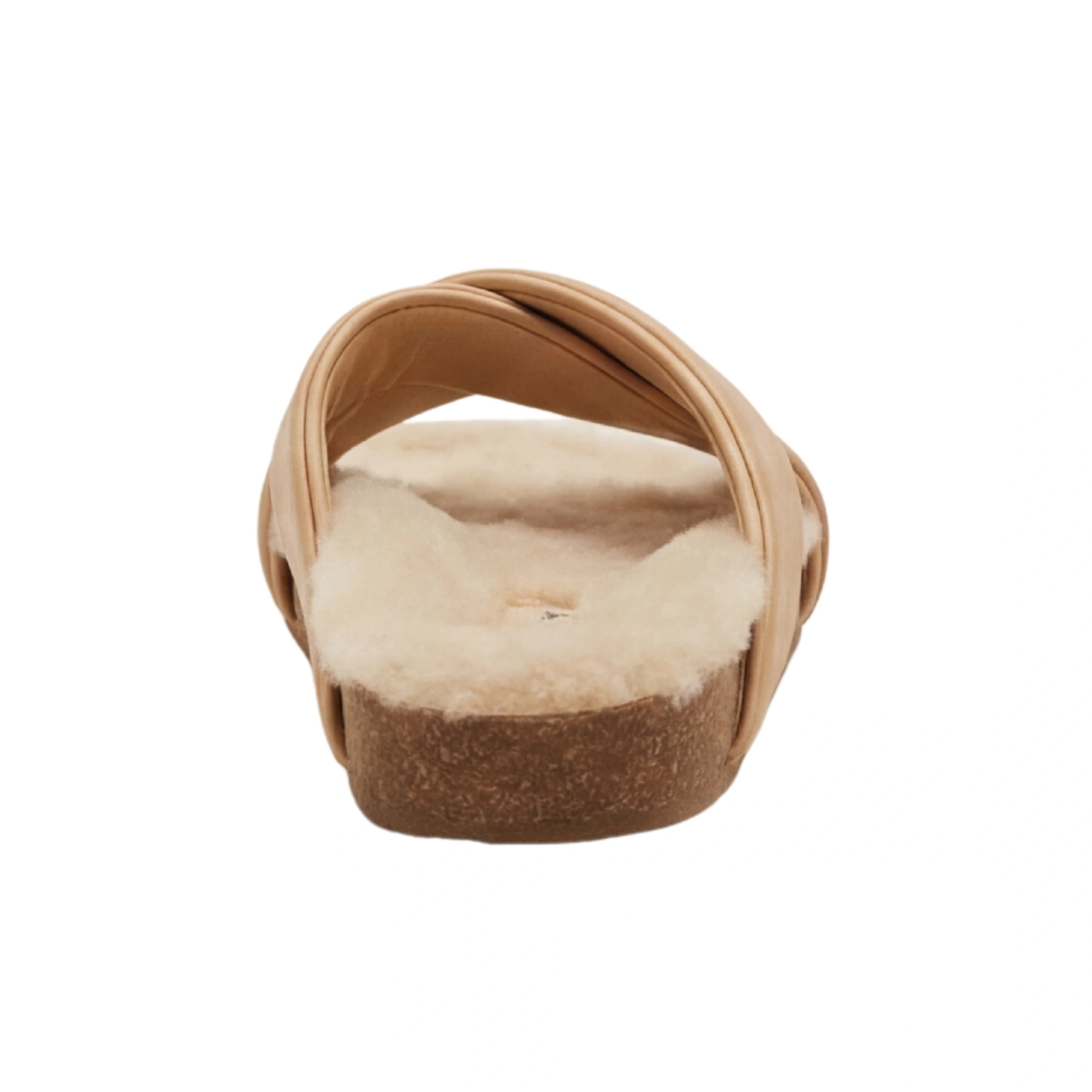 Buttery Leather Straps: Features wide, overlapping cross-straps crafted from supple tan leather, offering a clean and modern contrast to the fuzzy texture of the shearling.