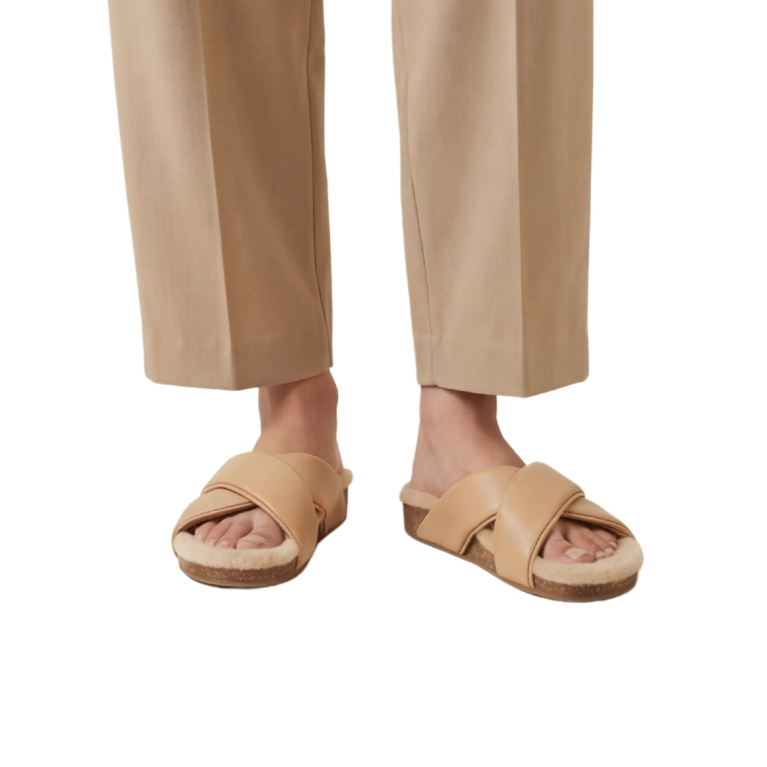 Tan Shearling Cross-Strap Slides offer a luxurious and tactile approach to relaxed footwear, blending the comfort of a slipper with the structure of a premium outdoor sandal. This design focuses on high-quality natural textures to create a cozy yet sophisticated aesthetic for refined lounging or casual outings.